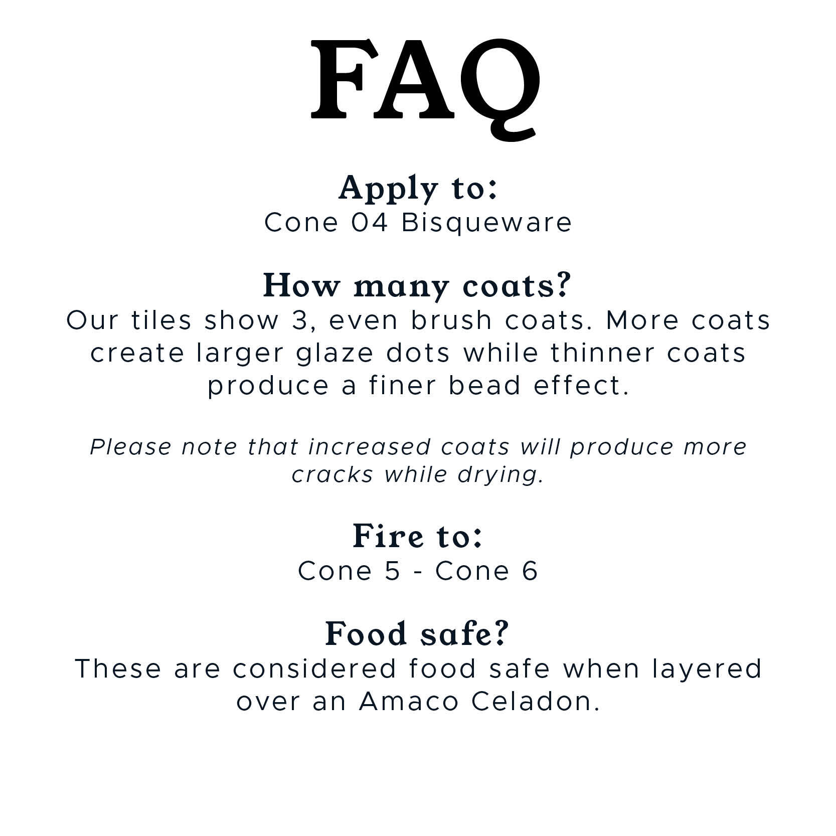 More coats create larger glaze dots, while thinner coats produce a finer bead effect. Increased coats will produce more cracks. Fire to cone 5-6 for best results.