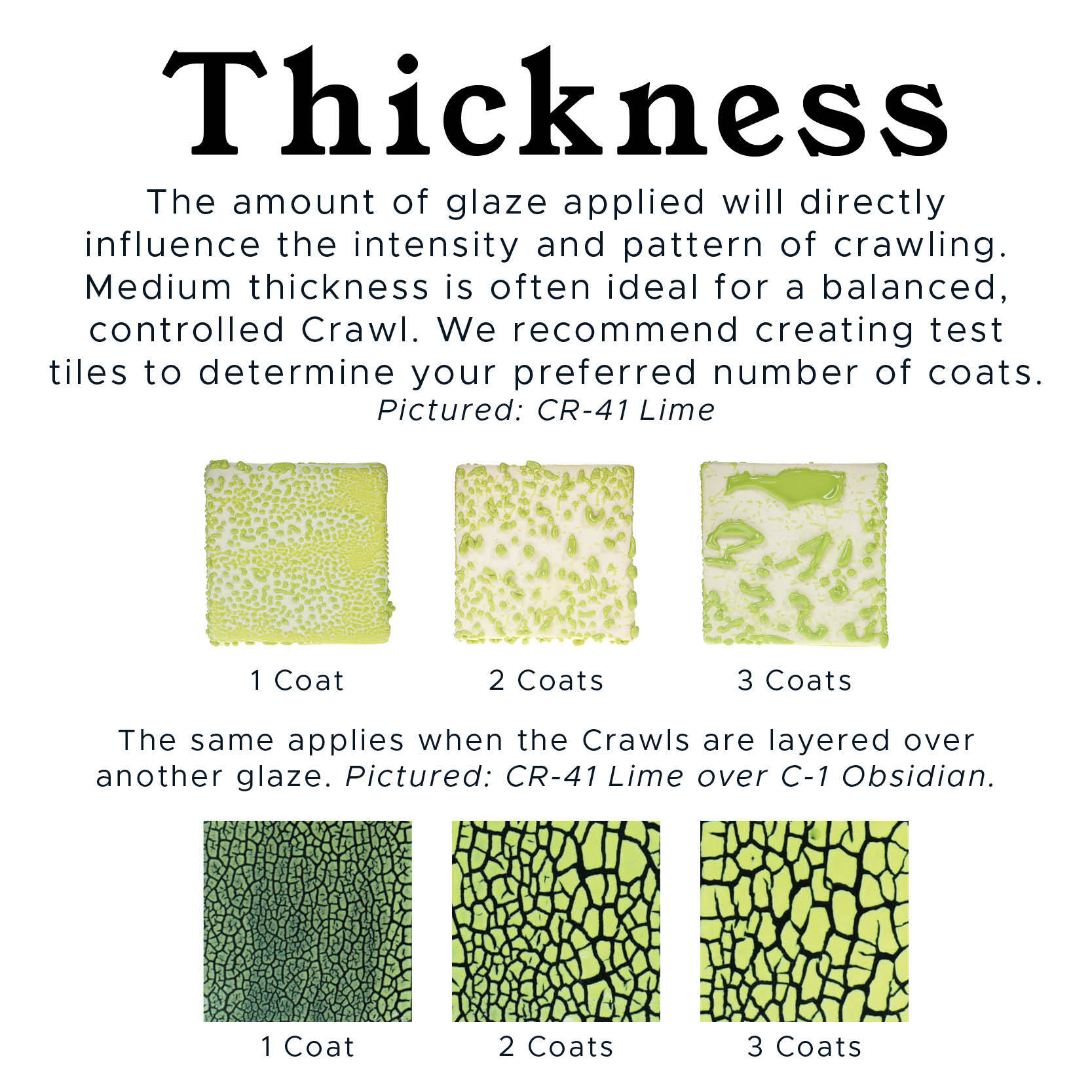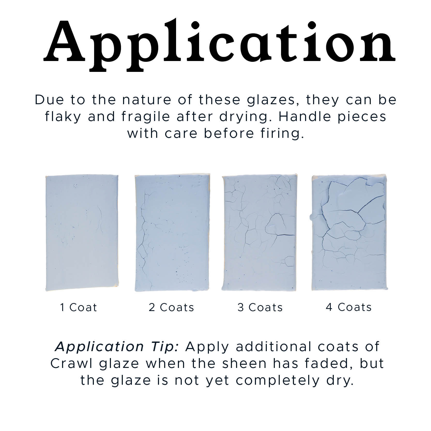Apply 1-4 even coats of glaze to cone 04 bisque. Allow each coat to dry almost fully, but before any significant cracking occurs. Crawl glazes will develop hairline cracks as they dry; handle with care. For added durability before firing, layer over an AMACO Celadon glaze or underglaze.