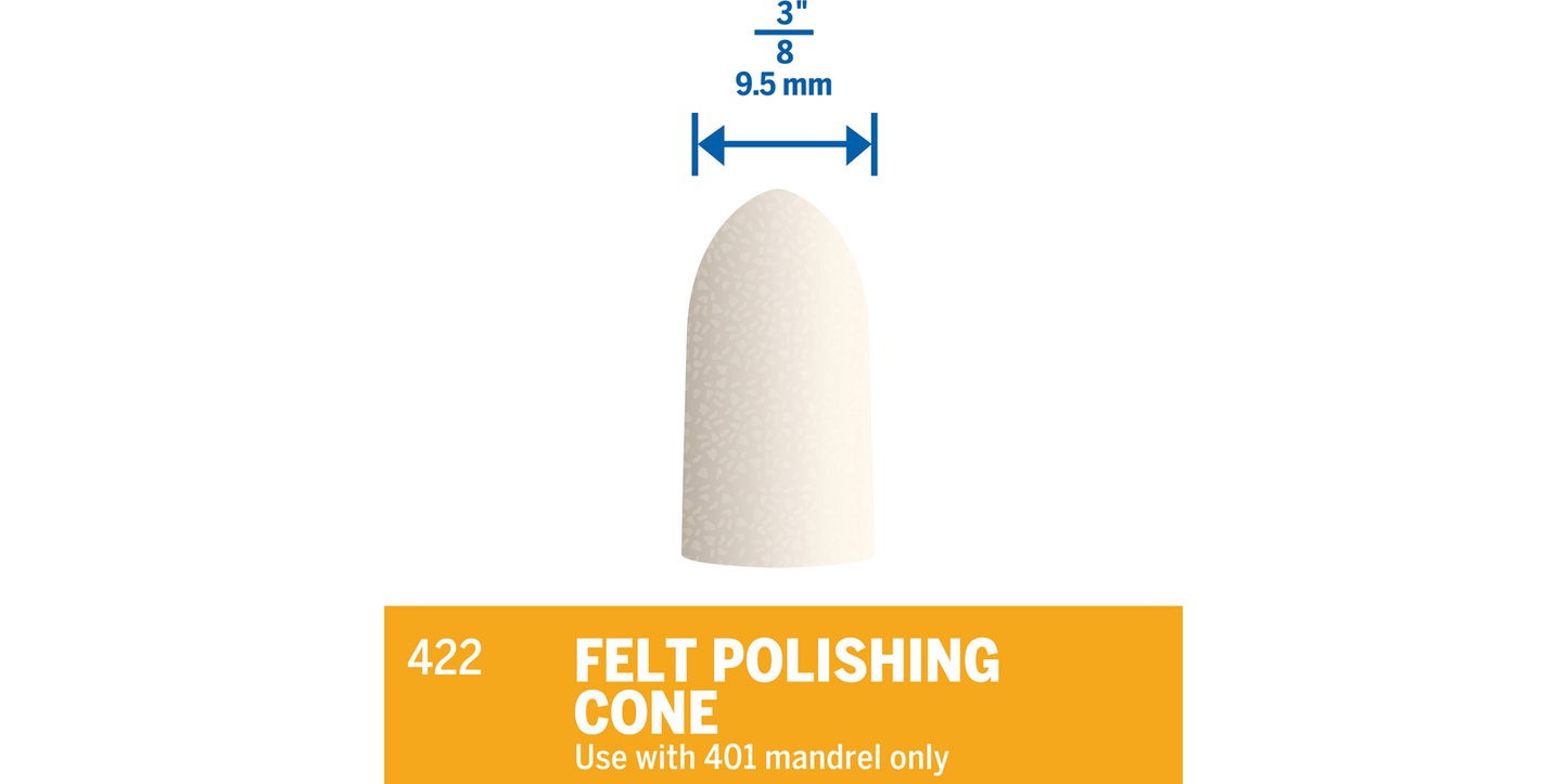 Convierta su herramienta rotativa Dremel en una potente pulidora con el cono de pulido de fieltro 422. Bueno para pulir metales, plásticos, piedras, cerámica y vidrio. El accesorio de pulido está hecho para tomar un acabado semirrugoso y pulirlo hasta obtener un acabado liso. La forma estrecha del accesorio es excelente para pulir rincones y lugares de difícil acceso. Funciona mejor con el compuesto de pulido 421, que permite una limpieza más profunda del material y produce un alto brillo.