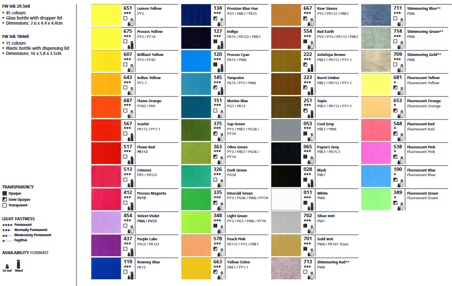 Daler-Rowney FW Ink is an acrylic pigment-based, water-resistant ink with a high degree of lightfastness and intermixability. FW Acrylic Inks can be used straight out of the dropper, or diluted to achieve the most subtle of tones, very similar in character to watercolour. Such washes will dry to a water-resistant film on virtually all surfaces (please prepare your surface and test on a small area in advance) and successive layers of colour can be laid over.