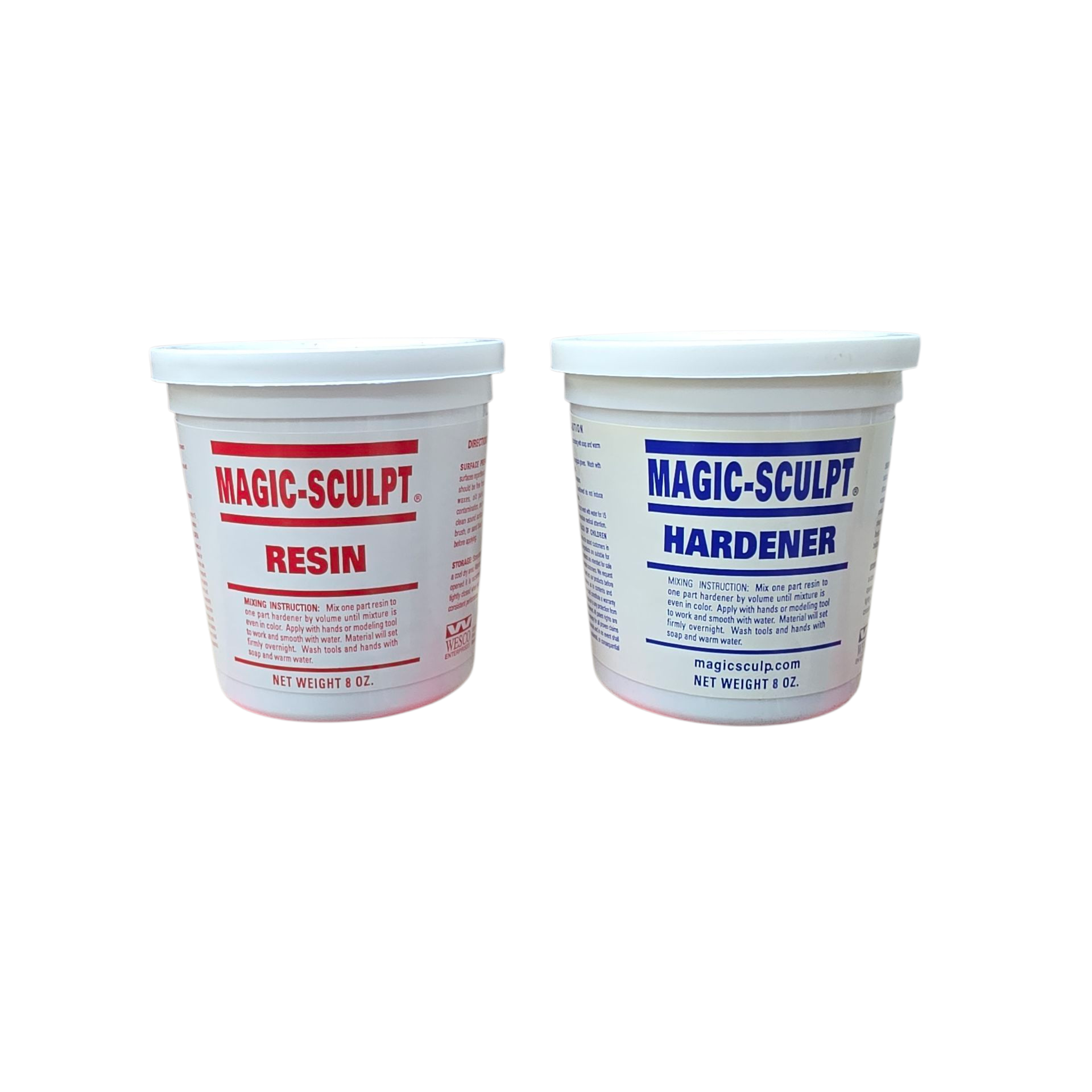 - Magic-Sculpt es una masilla epoxi de dos componentes que viene en dos recipientes (como se ve arriba), uno de resina y un endurecedor. Magic-Sculpt se mezcla 1 a 1 por volumen en pequeñas cantidades según lo necesite. Casi cualquier cosa se puede utilizar como armadura, como por ejemplo; alambre de armadura, malla metálica, espuma de poliestireno, madera y bolas de papel de aluminio.