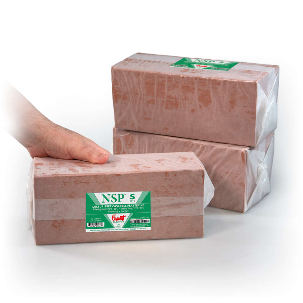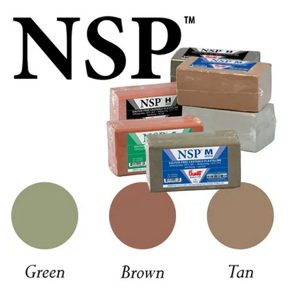 La línea de productos NSP consta de arcillas que contienen un mayor porcentaje de componentes de cera, lo que hace que las arcillas sean algo "más duras". Disponibles en blanda, media o dura, estas arcillas tienen buenas cualidades adhesivas, flexibilidad y longitud. Debido a que son “más resistentes”, NSP tiende a aceptar líneas de detalle cortadas de manera muy limpia, sin bordes irregulares. La textura de la superficie del NSP será algo “agarre” en comparación con las arcillas a base de azufre e incluso el NSP – Soft es bastante firme para los estándares de algunas personas.