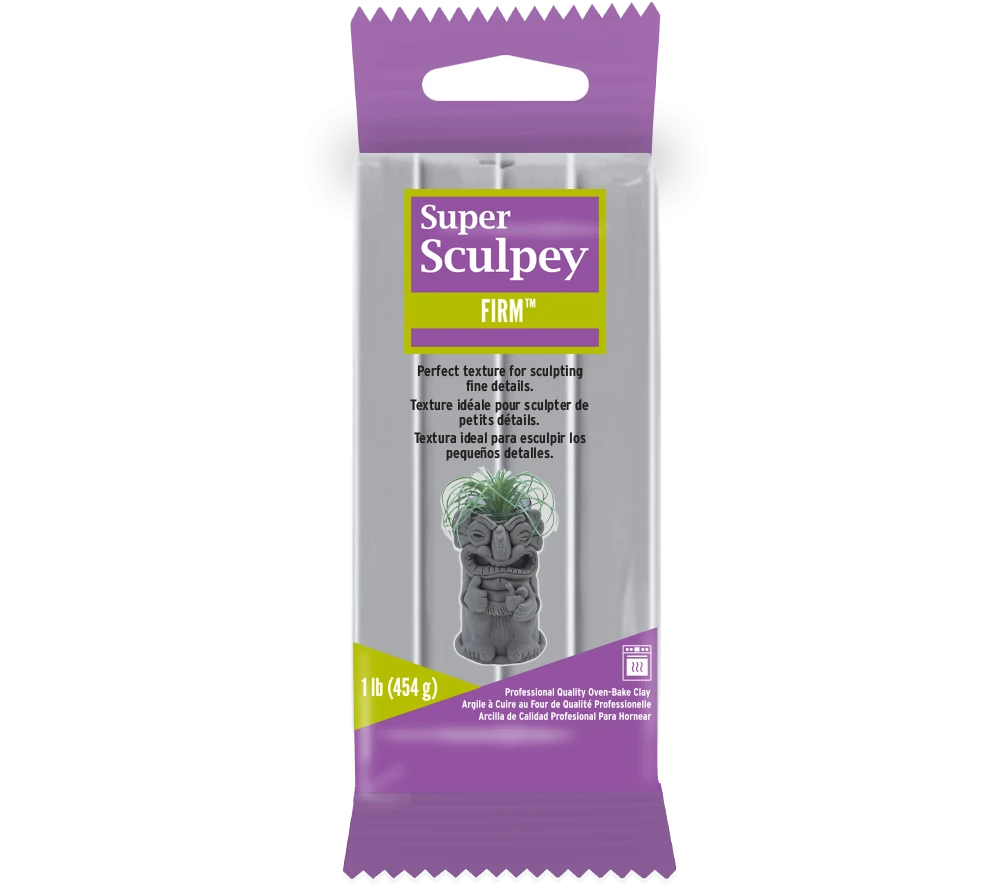 Super Sculpey® Firm es la respuesta al deseo de muchos escultores de una arcilla que puedan tallar, modelar y detallar sin la difuminación y flexión que se encuentran en las arcillas poliméricas más suaves. Esta arcilla polimérica firme es de color gris, lo que facilita que tanto los escultores como los fotógrafos vean hasta el más mínimo detalle y, cuando sea necesario, capturarlo en película. Después de curar en el horno, Super Sculpey® Firm se puede lijar, taladrar, tallar y pintar con pintura acrílica a base de agua.