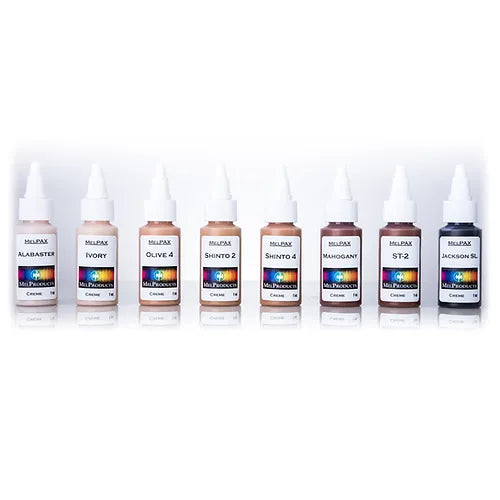 MelPAX es un maquillaje adhesivo a base de agua seguro para la piel . MelPAX se usa más comúnmente para pintar prótesis de espuma de látex y también el maquillaje más común para cubrir tatuajes. MelPAX es el maquillaje más resistente y duradero disponible para Tattoo Cover. Una vez seco, MelPAX es resistente al agua, al sudor, a las manchas y a las manchas.