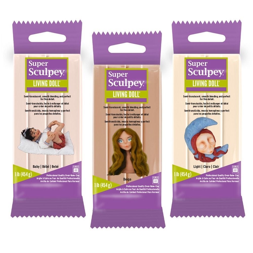 La arcilla polimérica Living Doll™ de Sculpey® está disponible en tres tonos de piel realistas: bebé, beige y claro. Los artesanos pueden colorear o teñir esta arcilla con cualquier arcilla Sculpey Premo™ para hacer varias mezclas de tonos de piel mientras mantienen la calidad translúcida de la arcilla Super Sculpey Living Doll™. La arcilla también es increíblemente fuerte y duradera después del curado.