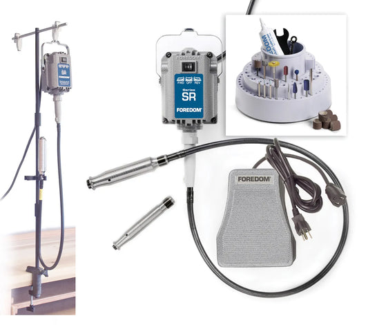 Alat putar foredom & mesin aci fleksibel dibina mengikut piawaian industri. Foredom terkenal dengan kualiti dan kebolehpercayaan. Sesetengah orang mengatakan Foredom - apabila mereka maksudkan mana-mana Mesin Aci Fleksibel. Aci lentur digunakan untuk banyak kerja termasuk pengisaran, deburring, ukiran, ukiran, penetapan batu, dan penggilap pada hampir semua bahan. Mesin aci fleksibel Foredom yang lengkap mempunyai motor yang memutarkan aci fleksibel yang disambungkan kepada alat tangan ketepatan, ditambah - ia memerlukan kawalan kelajuan boleh laras dengan kaki atau tangan.