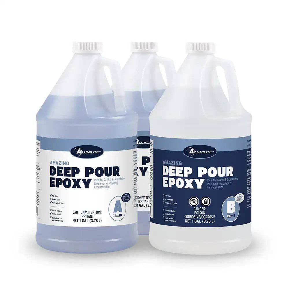 Produk nisbah campuran 2:1 ini dirumus untuk mengurangkan eksoterma (pembinaan haba), membolehkan pengguna menuangkan bahagian yang lebih tebal tanpa penangguhan lapisan seperti dengan epoksi standard. Amazing Deep Pour serasi dengan Alumilite Dyes dan Polycolor Resin Powders, Glow Powder dan Glitters. Pewarna lain mungkin serasi, ujian diperlukan.