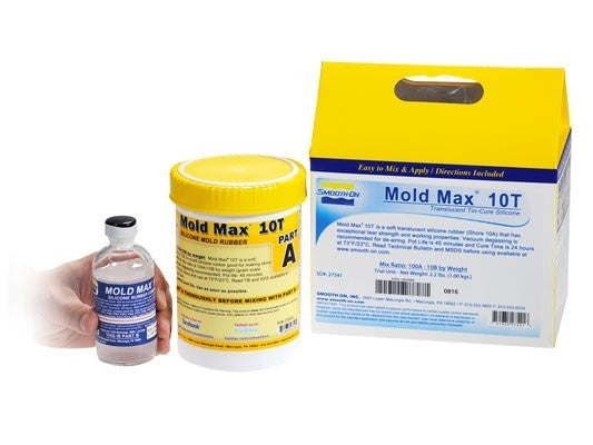 Silikon Mould Max™ 10T ialah sebatian getah silikon terawat timah lut sinar putih air yang mempunyai kekuatan koyak yang luar biasa dan sifat kerja. Ia menampilkan pemangkin "Libra™" Smooth-On untuk hayat perpustakaan yang panjang. Campuran 100A:10B mengikut berat, penyahgasan vakum disyorkan untuk nyahsiaran. Getah menyembuhkan semalaman pada suhu bilik. Silikon Mould Max™ 'T' boleh dipekatkan dengan pemekat Thi‑Vex™ untuk aplikasi dan kesan berus.