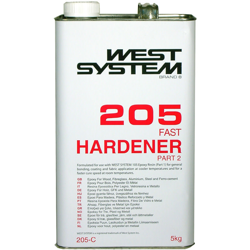 205 Fast Hardener is a medium-viscosity epoxy curing agent. It is useful in a majority of bonding situations, and at lower temperatures. 205 Fast Hardener produces a rapid epoxy cure that develops physical properties quickly at room temperature. Mix it with WEST SYSTEM 105 Resin in a five-part resin to one-part hardener ratio. The resulting cured epoxy is a rigid, high-strength, moisture-resistant solid. The combination of 105 Resin/205 Fast Hardener has excellent bonding and coating properties.