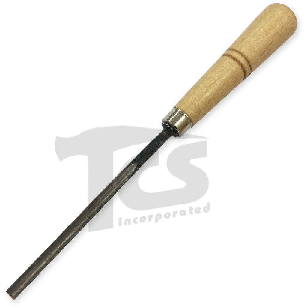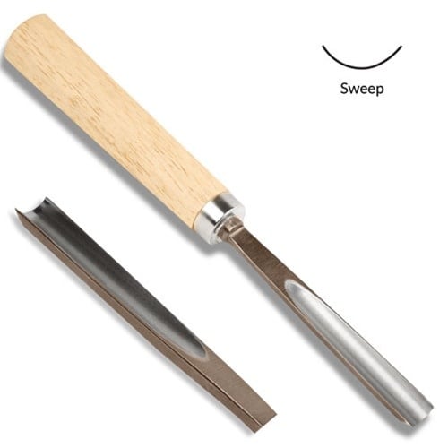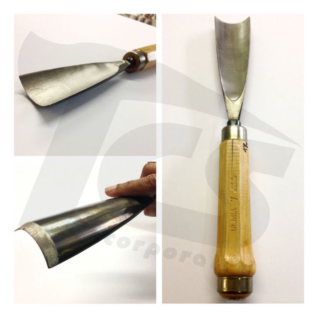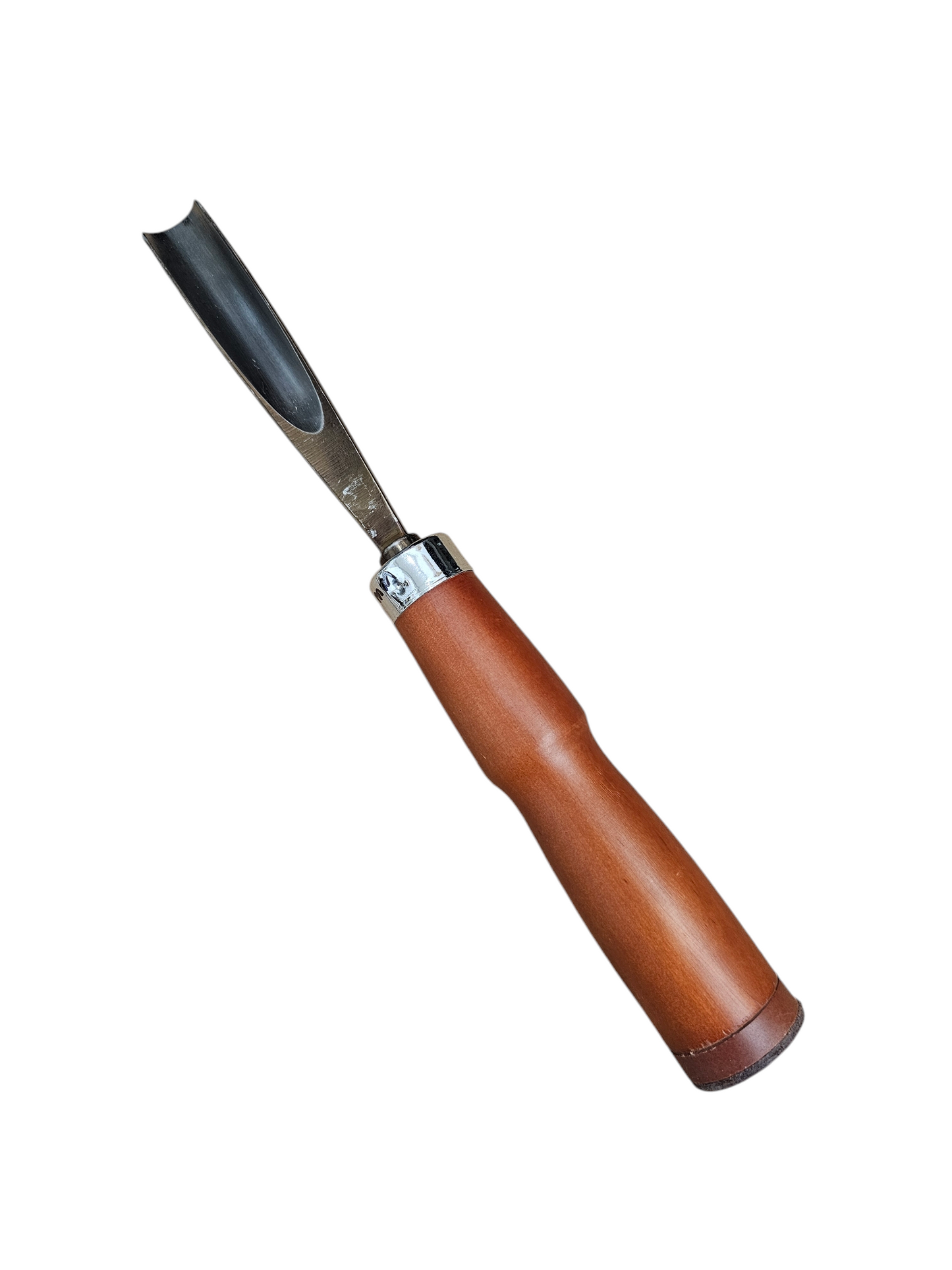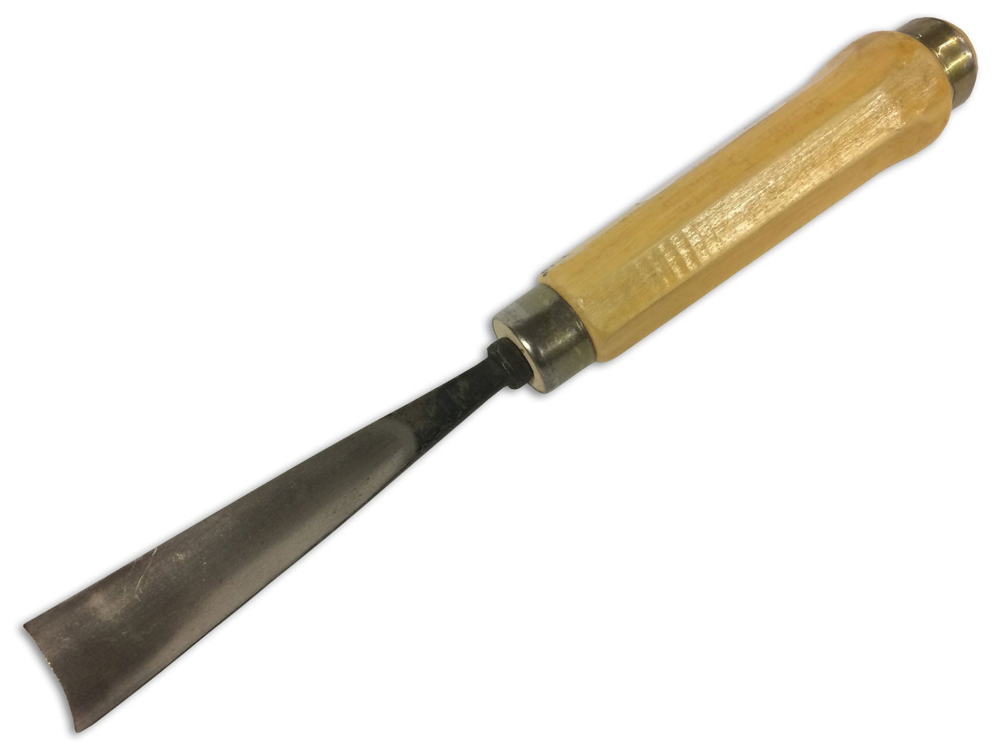 These tools, with a curved cutting edge of 1/8" to 2" from tip to tip, is made from Beautiful, highly polished tool steel. The steel (Grade 1095C) is high carbon steel, tempered or heat treated to harden the steel so it maintains a sharp edge, will range approx. 59 to 62 hardness. A hand forged with high carbon tool steel, with a hardwood handle (handle shape may vary).