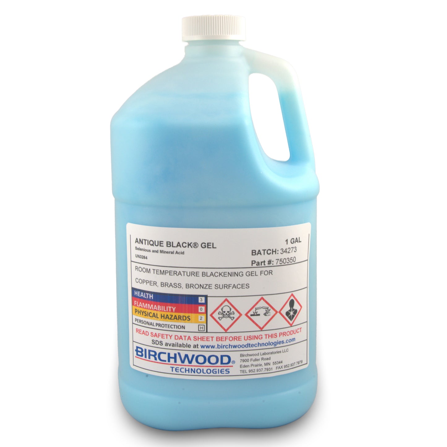 ANTIQUE BLACK GEL is a Room Temperature brush-on blackening gel for all copper, brass and bronze surfaces. This new blackening gel makes it easy to achieve uniform, tightly adherent black finishes on surfaces of any size and shape and offers the user an extra measure of control over the finishing of the workpiece. The unique gel consistency makes it possible to overcome many common application challenges, such as achieving uniform applications, controlling runs & drips, minimizing solution loss due to runoff and inhibiting flash rusting of the surface. The gel stays on the part with no loss of product due to runoff, and leaves an invisible protective film on the surface to inhibit flash rusting during drying. Even works on vertical surfaces! In short, the ANTIQUE BLACKÒ GEL simplifies the entire blackening operation and improves the quality of the final finish.