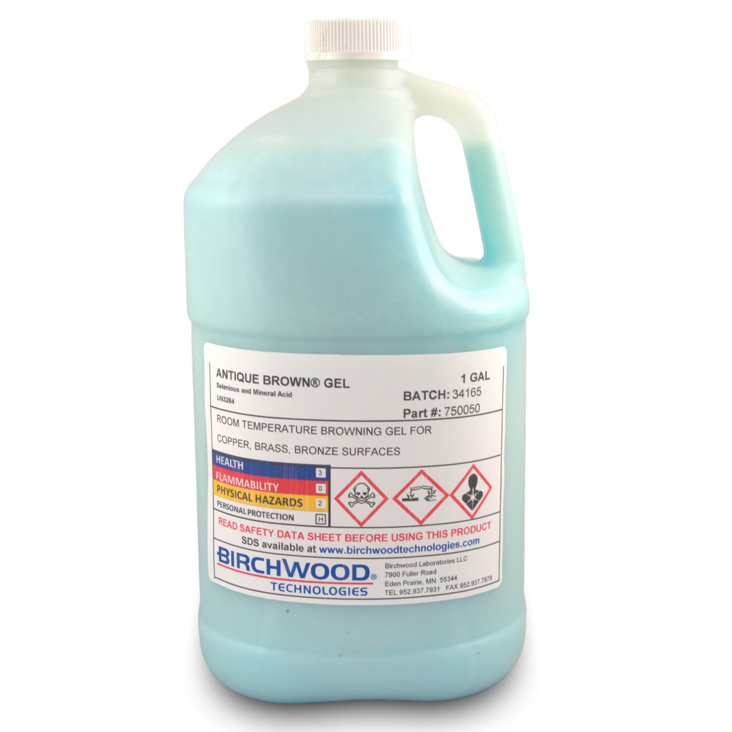 ANTIQUE BROWN GEL is a Room Temperature brush-on browning agent for all copper, brass and bronze surfaces. This new gel makes it easy to achieve uniform, tightly adherent brown finishes on surfaces of any size and shape and offers the user an extra measure of control over the finishing of the workpiece. The unique gel consistency makes it possible to overcome many common application challenges, such as achieving uniform applications, controlling runs & drips, minimizing solution loss due to runoff and inhibiting flash rusting of the surface. The gel stays on the part with no loss of product due to runoff, and leaves an invisible protective film on the surface to inhibit discoloration and water-staining during drying. Even works on vertical surfaces! In short, the ANTIQUE BROWN GEL simplifies the entire coating operation and improves the quality of the final finish.