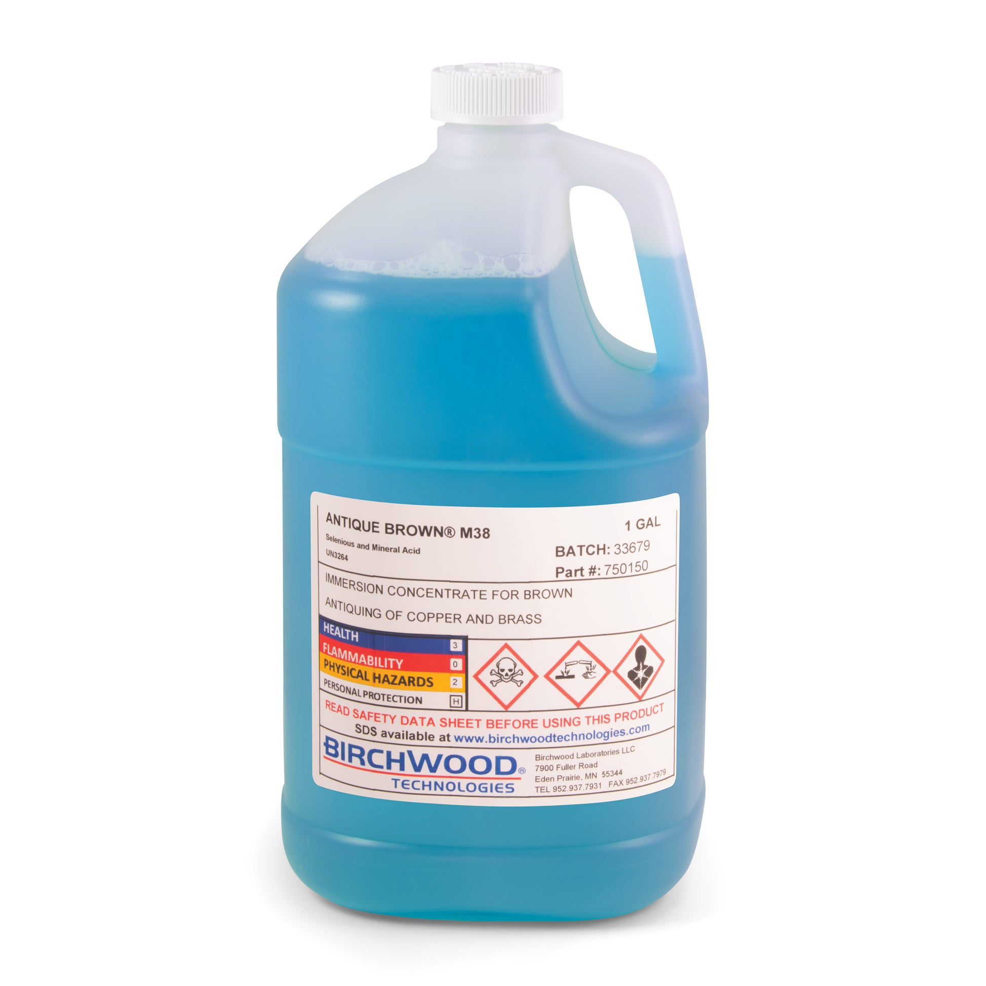 ANTIQUE BROWN M38 browning solution operates at room temperature to form attractive brown coatings on brass, bronze & copper surfaces – either solid or electroplated. This product is formulated to allow the user to generate repeatable pleasing color tones ranging from golden to chocolate brown, including US10B and oil-rubbed bronze finishes. The M38 can be mixed with water to make up an immersion bath for bulk loads of parts. Or, it can be used undiluted as a brush-on browning solution for large surfaces.
