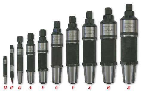 Available in 10 sizes: The tiny ones are the P and the D, they can take 5mm shank chisels. The P can be used one-handed as it is spring loaded, and the D is the smallest of the standard air hammers.