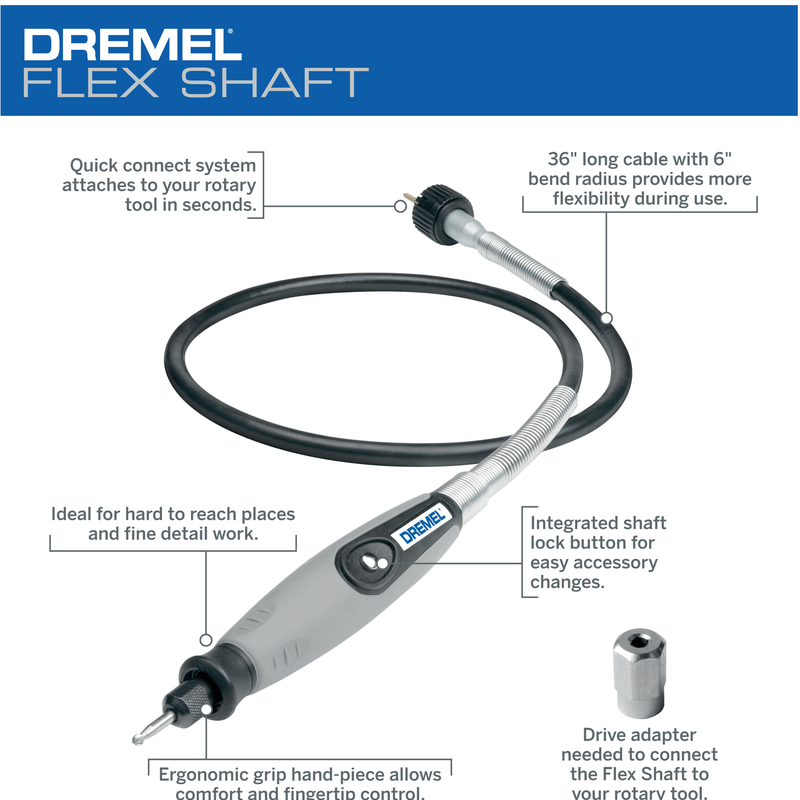 Tight spots, nooks, and corners they're all easily within reach when you add the 225 Flex Shaft attachment to a Dremel Rotary Tool. The Dremel Flex Shaft features a flexible 36-inch cable with a 5-inch bend radius, allowing you to comfortably reach your work in a variety of angles. The ergonomic comfort grip hand-piece reduces fatigue and allows for fingertip control to cut, grind, sand, sharpen, polish and more. The Quick Connect system makes it easy to attach to your compatible Dremel rotary tool.