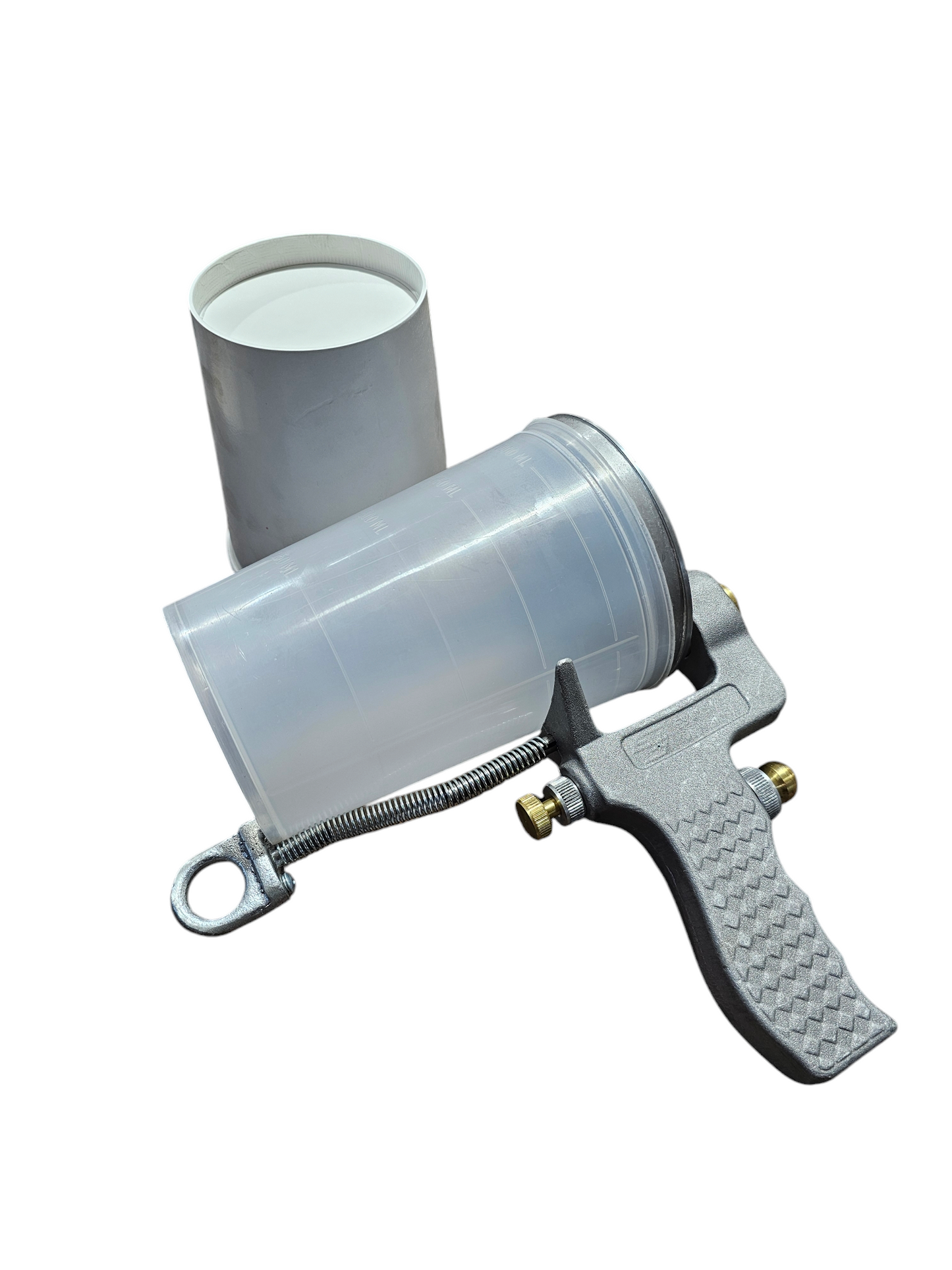 Complete with FN6 nozzle, lid, plastic cup, paper cup and cup liner. A great name for a great tool. This gravity feed sprayer can be used for a variety of materials. From paint to plaster, from resin to rubber. With our largest nozzle, it will even sand blast. This gun is used for spraying not only gelcoat and resins, but other materials such as parting films, spray gypsum, tooling gelcoats, sand able primers, granite enhanced gelcoats, adhesives and paints. This professional grade sprayer is a must for every fiberglass, composite and cultured marble shop. The easy to clean design means clean up times less than five minutes. Wipe the lid and nozzle, through away the cup, and you're ready to go again. We have also designed the gun to work with standard paper cups. "Take a Dump Today".