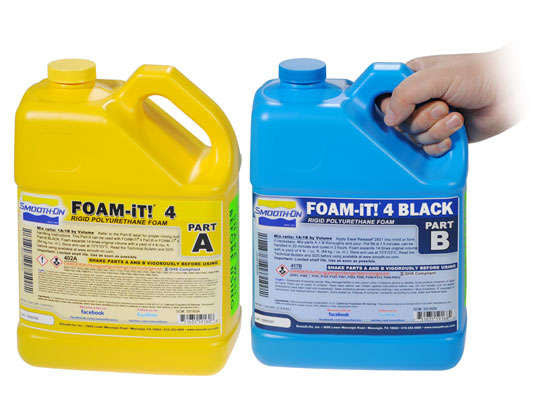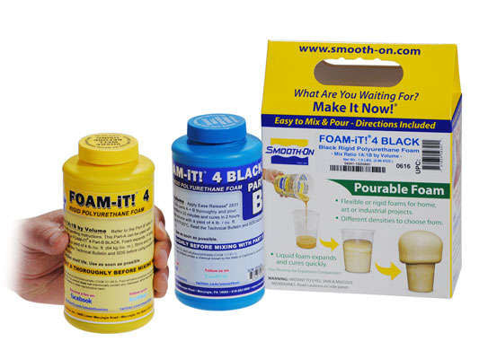 Smooth-On’s FOAM-iT!™ Series are two-component water blown rigid foams that are versatile and easy to use. FOAM-iT!™ products are available in 3lb., 4 lb., 5 lb., 8 lb., 10 lb.,15 lb. or 26 lb. per cubic foot densities. Parts A and B are measured and mixed in equal amounts by volume. The mixture is then poured into a mold or other form (apply release agent if necessary). The mixture will expand many times original volume (depending on which FOAM-iT!™ product you are using) and develop a uniform cell structure. FOAM-iT!™ 4 Black is pre-pigmented to a very deep black color.