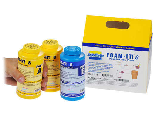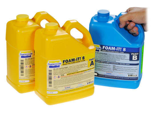 Smooth-On’s FOAM-iT!™ Series are two-component water blown rigid foams that are versatile and easy to use. FOAM-iT!™ products are available in 3lb., 4 lb., 5 lb., 8 lb., 10 lb.,15 lb. or 26 lb. per cubic foot densities. Parts A and B are measured and mixed 2A:1B by weight. The mixture is then poured into a mold or other form (apply release agent if necessary). The mixture will expand many times original volume (depending on which FOAM-iT!™ product you are using) and develop a uniform cell structure. FOAM-iT!™ 8 is a unique, self-skinning foam with a finer, more uniform cell structure than the other FOAM-iT!™ products FOAM-iT!™ 8 can be cast in blocks as a machinable prototype modeling board.