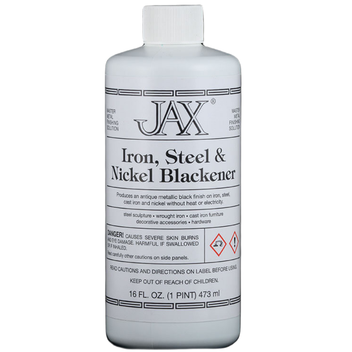 Use a bristle brush, sponge or rag and apply the JAX Iron, Steel and Nickel Blackener directly to the metal. You may also dip the entire object into the solution. However, do not leave the metal in the solution, or the solution on the metal, for longer than necessary. If the metal is clean, the JAX Iron, Steel and Nickel Blackener will work quickly. If left for too long the Iron, Steel and Nickel Blackener will rub off the metal easily. Practice and experience will help you find the right timing for your work.