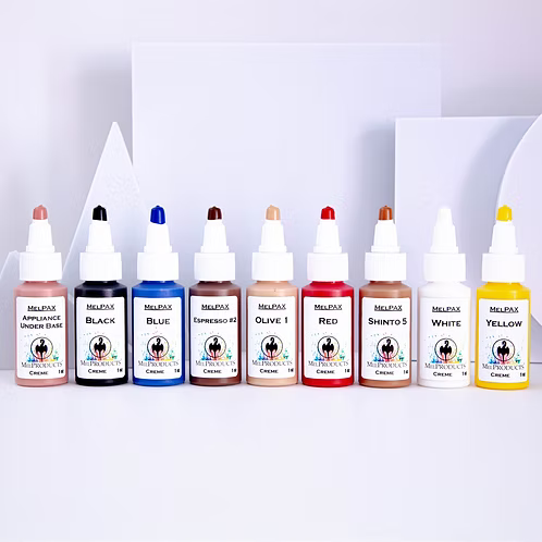 MelPAX is a skin safe Adhesive-Waterbasd Makeup. MelPAX is most commonly used for painting Foam Latex Prosthetics and also the most common used Makeup for a Tattoo Cover Up. MelPAX is the most durable and long lasting makeup available for Tattoo Cover. Once dry, MelPAX is Water Resistant, Sweat Proof, Smudge Proof and Smear Proof.