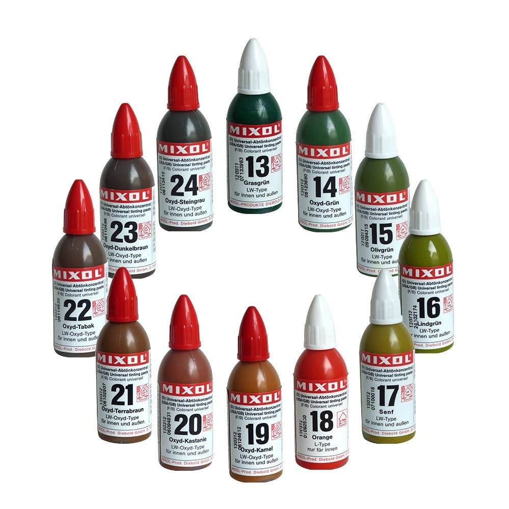 MIXOL® is a binder-free multi-purpose tinting paste – not a ready-made paint! – Shake thoroughly before and close firmly after use so MIXOL® will not dry out or form lumps or skin. MIXOL® is highly resistant to frost and heat. After freezing it needs only to be thawed at room temperature. Then shake thoroughly and it is ready for use again. Depending on the paint concerned, MIXOL® may be added up to a maximum of 10 % by weight. But considering that it is highly concentrated, you can obtain best results by adding a minimum of MIXOL® (please see the percentage additions in the MIXOL®colour card). The maximum additions are: 10 % to latex and/or emulsion paints, 5–8 % to paints, lacquers, varnishes, high-solids, 6 % to acrylic paints, 3–5 % to transparent and/or clear lacquers, transparent paints, glazes, wood stains, waxes etc., 3 % for silicate and silicone paints and/or coatings. Use only MIXOL® oxide tints in varnishes low in or free from aromatic compounds or in paints containing silicate silicone resin! (Red cap = oxide type!) MIXOL® tints which are no “LW oxide types” are unsuitable or only suitable to a limited extent for colouring latex emulsions containing solvents, or for colouring polyester resin finishes, single or two component synthetic resin paints. In case of tinting lacquers sometimes MIXOL® cannot be mixed easily by hand, therefore use a stirring apparatus, if possible, to get optimal results and to avoid a rub-out effect. It is also important to test results after stirring! Always test for compatibility by means of a “rub-test”. Brush on some of the tinted paint and immediately rub hard with your finger. If it turns a darker shade, the material is either incompatible with MIXOL® or the concentrate has not been properly stirred in. Stir well again and repeat test. Add MIXOL® first and only then add the thinner if required! MIXOL® tints No. 6, 7, 10 and 18 are for indoor application only! When a yellow or red are required for external applications, use True Yellow No. 26, True Red No. 27 and Oxide Brilliant Yellow No. 30 instead of the internal quality No. 7 Canary Yellow and No. 10 Red. For internal application (e. g. on new wood and other surfaces) we also offer a multi-purpose concentrate White No. 25, which should be added to colourless coatings and/or transparent paints, glazes etc. to create a pickling effect. Attention: Please read the MIXOL® leaflets as well as the instructions and technical information in this colour chart and on the labels and be aware of the two different terms: