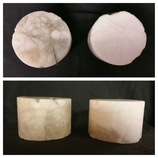 Imported from Italy, these translucent alabaster cylinders are used by students throughout Europe. The carving process has been quickened due to the reduction of the bulk geometric form into round carving cylinders. They can also be used for stone turning on a wood lathe for creating translucent bowls. With variations of white opaque with translucent white veins, some are more opaque and some are more translucent.