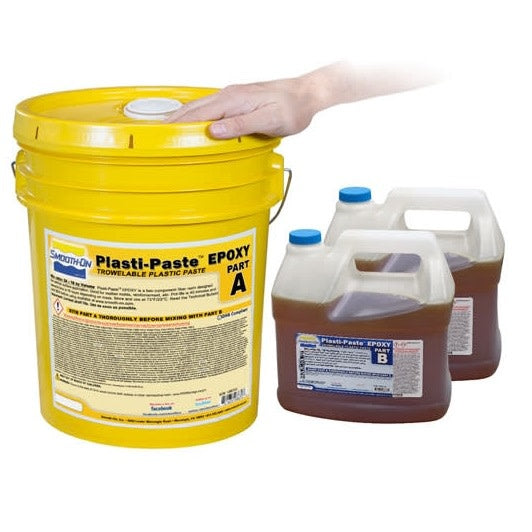 Plasti-Paste™ EPOXY is an epoxy-based version of Smooth-On’s popular urethane Plasti-Paste™ products. It is a two component, fiber-filled epoxy designed for vertical surface application. Part A is a paste and Part B is a liquid. Mix ratio is 2A: 1B by volume or weight. Pot life is 40 minutes and cure time is 16 hours at room temperature depending on mass. Applying heat can reduce cure time. Mixed material holds a vertical surface without sagging and cures very rigid and strong.