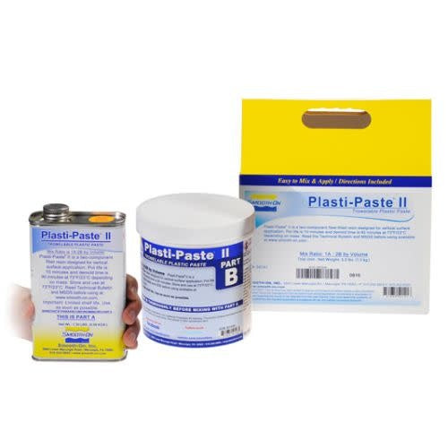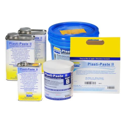 New Plasti-Paste™ II is a two component fiber-filled resin that is designed for vertical surface application. This no-odor formulation is an improved version of our original Plasti-Paste™ formula, and the cured product is different in the following ways: