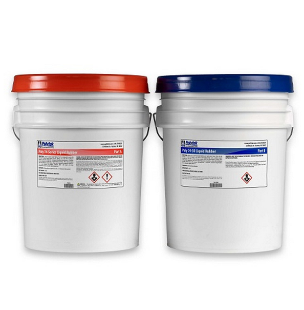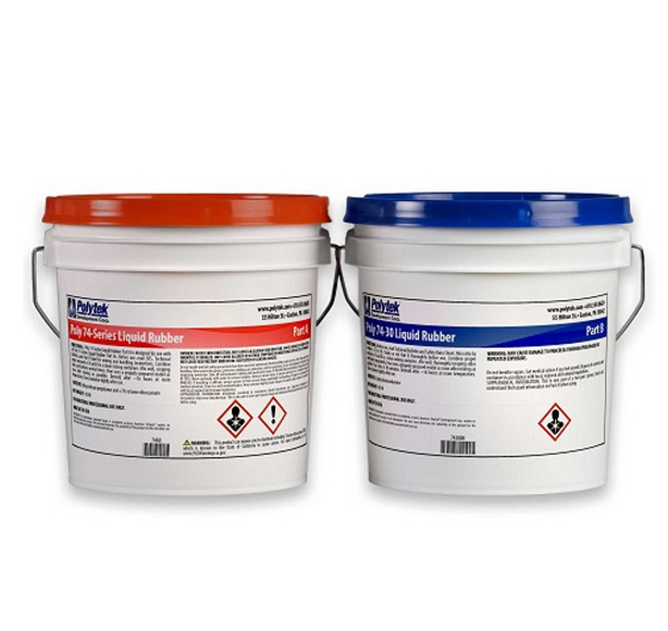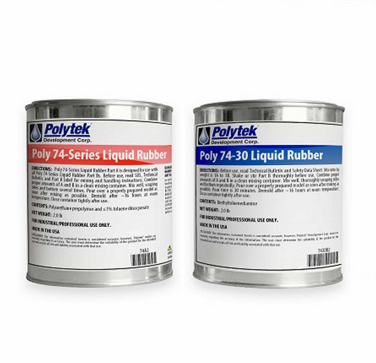 Poly 74-30 Liquid Rubber is a two-part, liquid polyurethane system that cures (RTV) to an amber (color varies), Shore A30 rubber. This is a pourable rubber, but it can be easily thickened with PolyFiber II Thickener for brush-on application. For a transparent, amber version of this rubber, consider Poly 74-30 Clear Liquid Rubber. For a high-tear version of this product, consider Poly 74-30 HT Liquid Rubber.