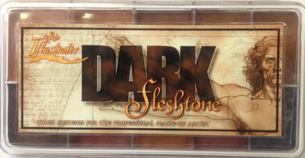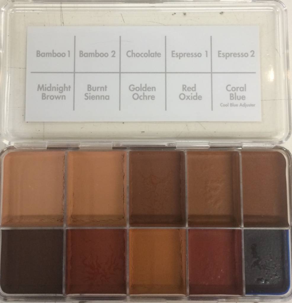 The third addition to the Skin Illustrator color system is the Dark Flesh Tone palette. Designed as the follow-up to the original Flesh Tone palette, the Dark colors complete the entire range of flesh tones. When combined with the FX and light Flesh Tone colors, the Dark Flesh Tone colors will allow the artist to duplicate virtually any skin tone, no matter how light or dark. The BAMBOO 1 and 2 colors are warmer yellow base tones than the LAO 1 and 2, offered in the original Flesh Tone palette. This significant difference gives the artist an even wider range of tone variation when blending colors. Other warm base tones include CHOCOLATE, ESPRESSO 1 and 2, and MIDNIGHT BROWN, the darkest of the base tones. BURNT SIENNA, GOLDEN OCHRE and RED OXIDE are all adjusting colors that alter the base tones in different ways, providing an endless array of color possibilities. By mixing MIDNIGHT BROWN with the BLACK tone from the FX Palette, the deepest ebony tones can be obtained, creating rich, natural colors that are not gray or ashy. When mixing MIDNIGHT BROWN with BAMBOO 1, you begin to create taupe colors, which are great for use as character shading colors. CORAL BLUE is a gentle wash-tone adjuster that will provide a cooling effect, different than the other blue tones found in the original Flesh Tone palette. The Dark Flesh Tone colors are also great for defining hairlines and filling in scalp patches. The CORAL BLUE and BURNT SIENNA are also fabulous for covering up beard shadow.