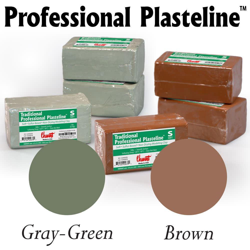 Professional Plasteline is one of the softest clays Chavant produces. DaVinci, Extra Soft and Soft, Clayette Soft and Monu-Melt Soft are even softer. The sulfur filler gives this clay a silky feel appreciated by many artists. The clay has some amount of length but is susceptible to cracks when armatures move under the weight of the clay. Professional Plasteline is available in Brown or Gray-Green.