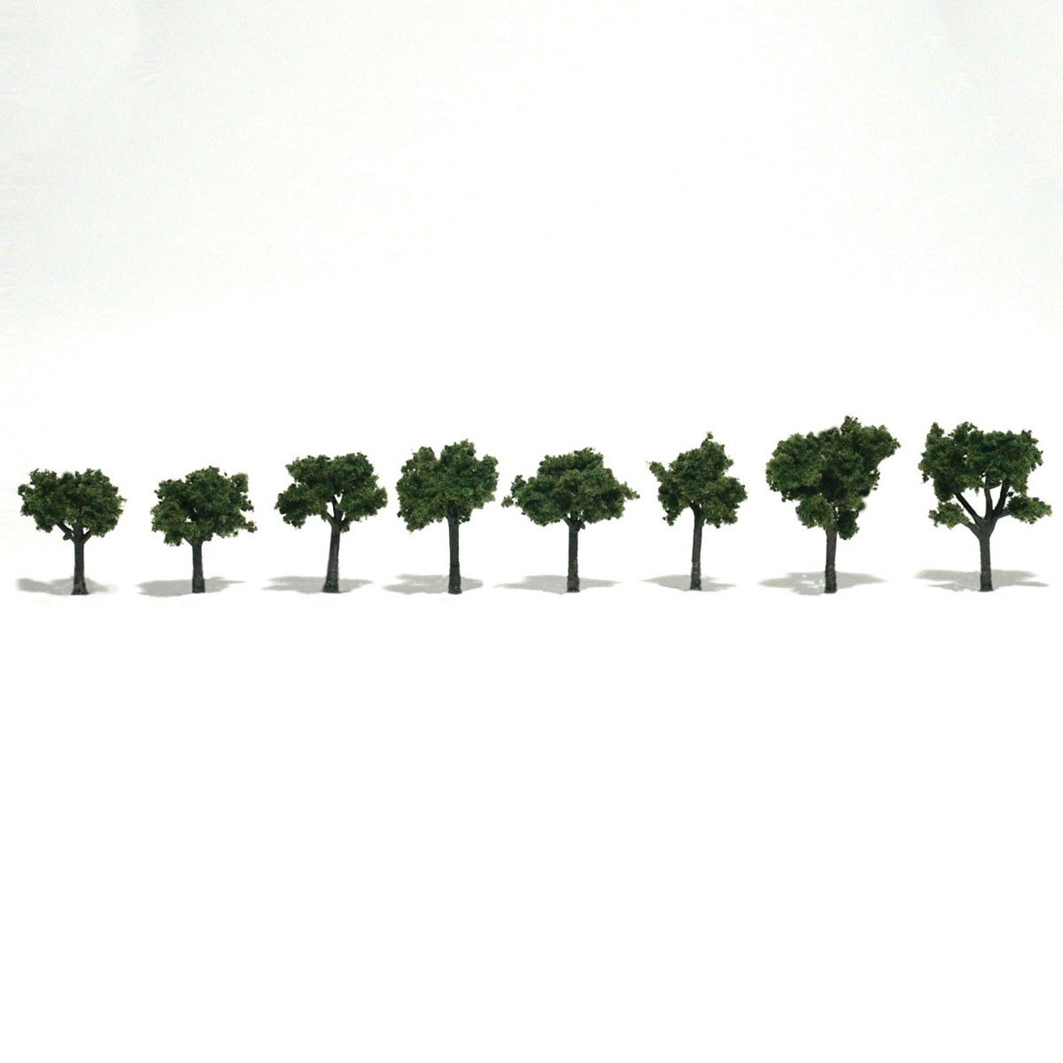 Medium Green (4pc) 2" - 3" (5.08 cm - 7.62 cm) - Four Medium Green deciduous trees range in height from 2in. to 3in. In scale, tree heights represent: 27-40 feet tall (N scale); 15-22 feet tall (HO scale); and 8-12 feet tall (O scale).