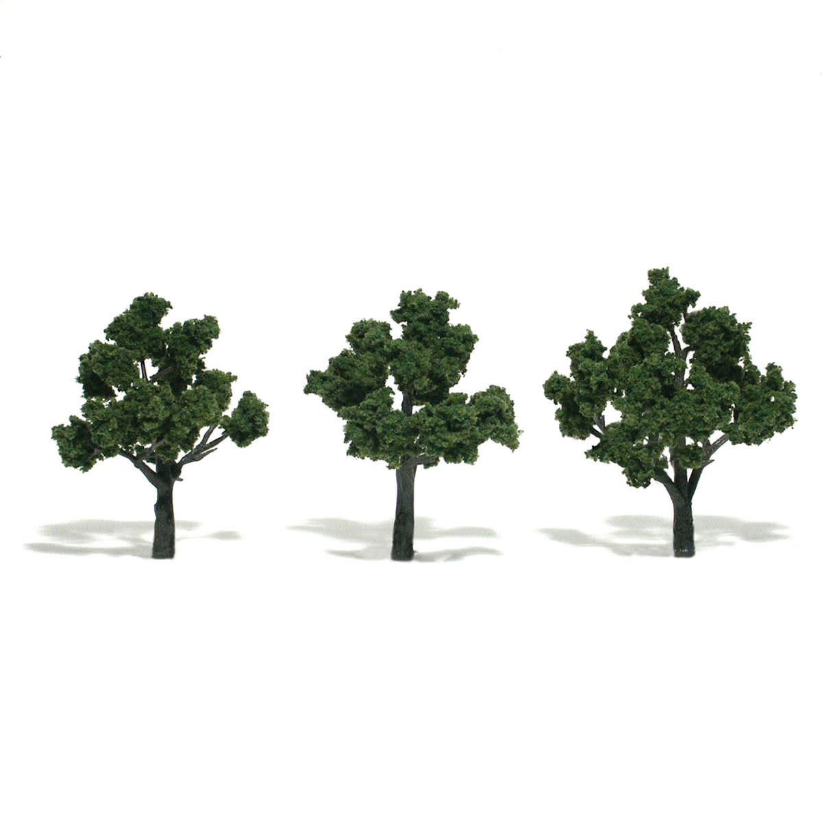 Medium Green (3pc) 3" - 4" (7.62 cm - 10.1 cm) - Three Medium Green deciduous trees range in height from 3in. to 4in. In scale, tree heights represent: 40-53 feet tall (N scale), 22-29 feet tall (HO scale); and 12-16 feet tall (O scale).