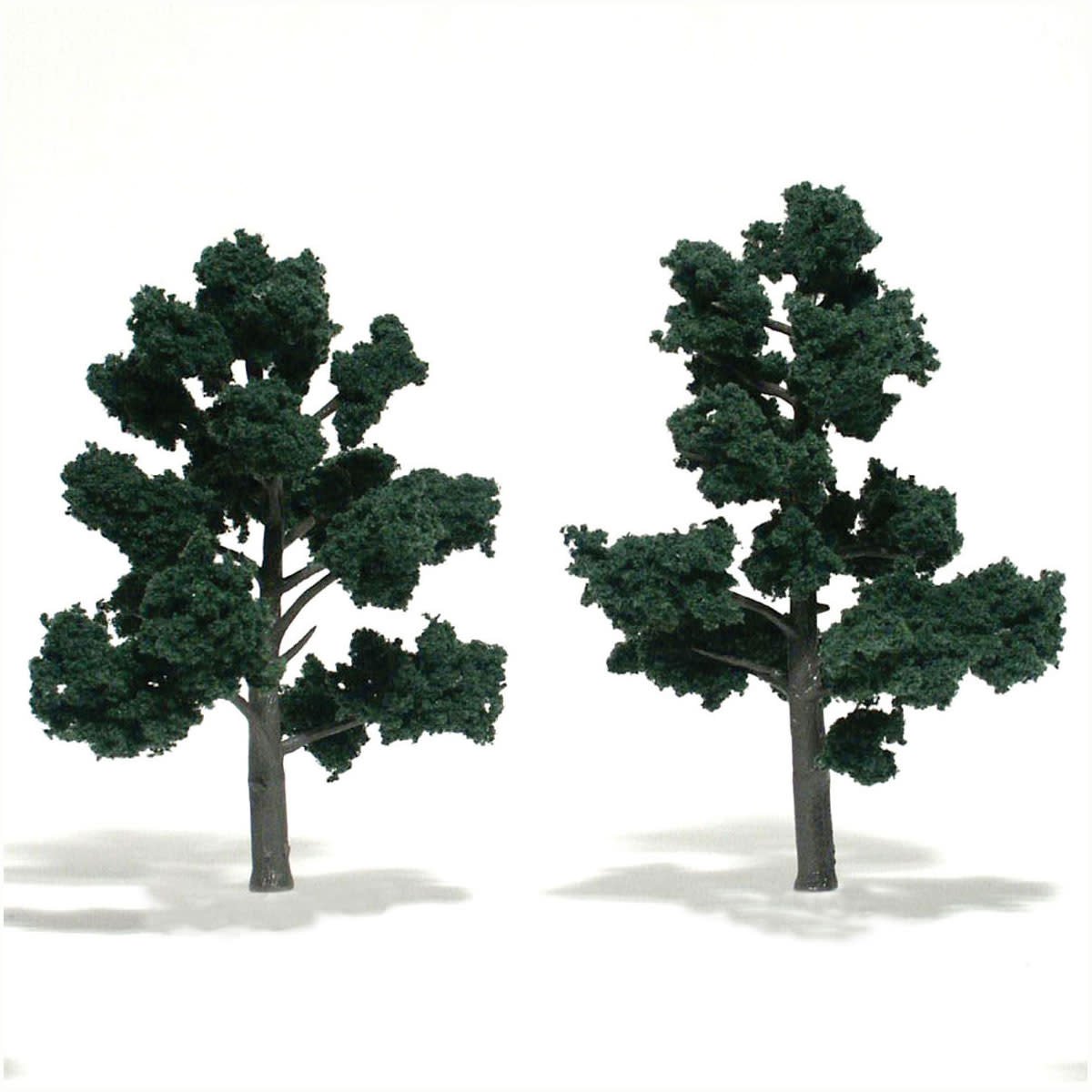 Dark Green (2pc) 5" - 6" (12.7 cm - 15.2 cm) - Two Dark Green deciduous trees range in height from 5in. to 6in. In scale, tree heights represent: 36-44 feet tall (HO scale); and 20-24 feet tall (O scale).