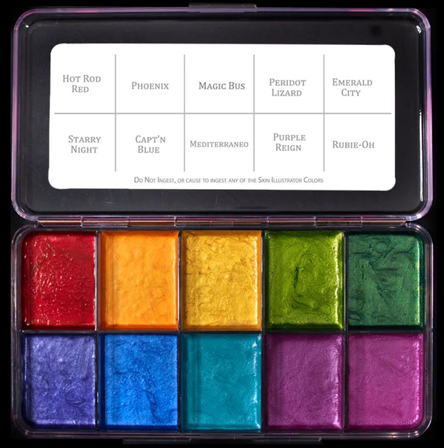 The Skin Illustrator On Set Nova Palette is a collection designed around the rainbow color spectrum.  Giving artists the ability to mix a wide range of unique bright metallic shades. Great for body paint, sci fi, fantasy and cosplay looks. Waterproof formula is perfect for underwater shoots for mermaids and more.