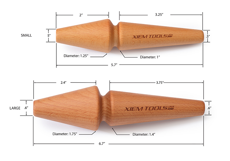 Xiem Teapot spout maker is the simplest, quickest, and most convenient way to make a perfect form-fitting spout to any shape and size teapot. Just wrap a clay slab around one of the taper tool-ends and join the two sides by pressing them together and smooth seamline evenly. Once stiff, it can be modified, cut, and attached to the pot. It is made of solid hard beech wood, hand-sanded, and was applied a quick coat of pure tung oil to prevent molds, termites, water, and deterioration from the weather over time. Available in two practical sizes-- small and medium. Each size has a short classic tapper shape and an extended taper shape on the opposite end. In addition, it is also an excellent tool to make feet and decorative elements.