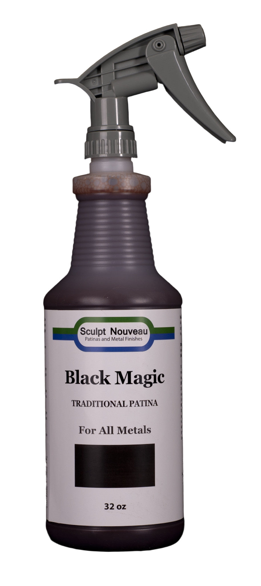 Black Magic Patina creates a beautiful, rich black patina on iron and steel. It takes only 3-5 minutes to develop and does not produce the quick rust that you normally see with other blackening agents. The first coat will be dark grey, but the finish will become black after a few coats. Rust will develop if a clear sealer is not applied to the completed finish.