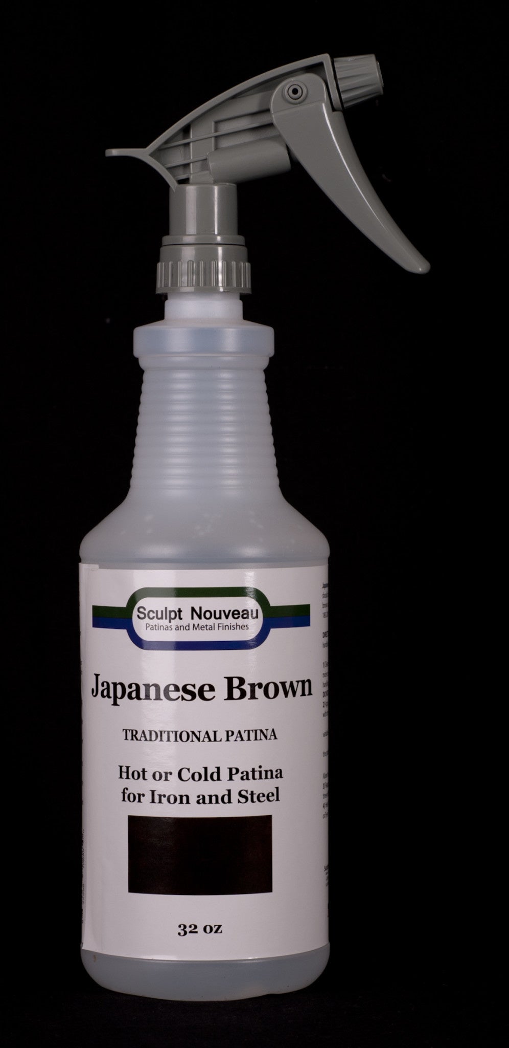 Japanese Brown may be used on bronze, brass, and copper resulting in a golden brown finish, but it is most commonly used hot or cold on iron and steel. When applied cold to iron or steel, a brown rust will form. On heated iron or steel, a dark chocolate finish will result. Heat will darken the color as well as reduce mottling.